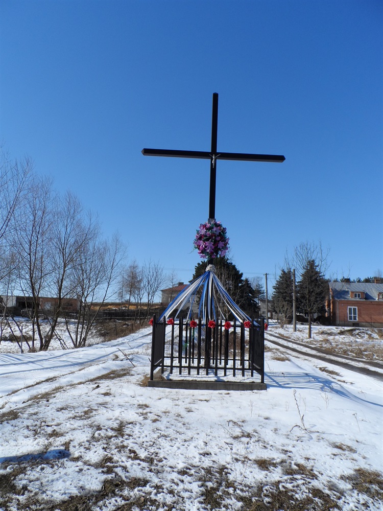 Krzyż znajduje się tuż przy wjeździe na most nad rzeką Wkrą. Jest to metalowy krzyż otoczony metalowym ogrodzeniem.