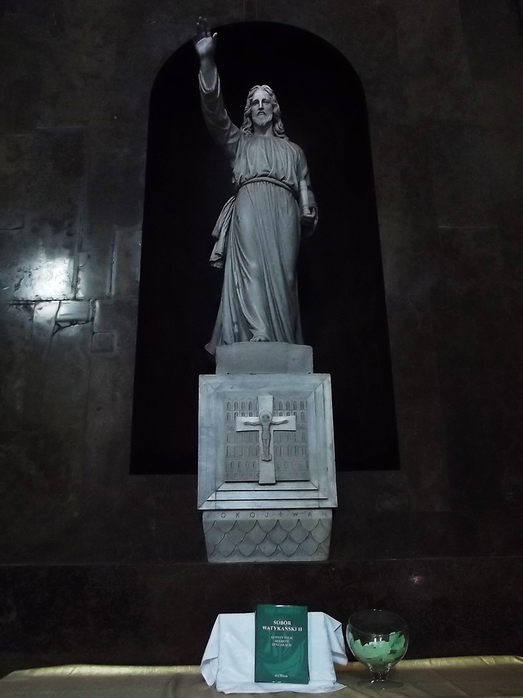 Jednym z nich jest marmurowa figura Pana Jezusa, z wyciągniętą w geście błogosławieństwa, prawą ręką. Jej autorem jest Wiktor Poleard Brodzki (1826 – 1904, wg Polskiego Słownika Biograficznego urodził się w 1917 r.), profesor petersburskiej Akademii Sztuk Pięknych, autor dekoracji wielu pałaców carskich. Prace nad figurą artysta rozpoczął już w 1884 r. Wtedy to zamówienie złożyła księżna Jabłonowska. Figura po raz pierwszy została zaprezentowana w styczniu 1890 na wystawie konkursowej w Zachęcie. Na przygotowane dla niej miejsce w kościele okazała się za duża i Jabłonowska wystawiła ją na sprzedaż. Nie doczekała się jednak nabywcy stojąc w Zachęcie przez 6 lat. Wówczas podczas wizyty w galerii, zauważył ją proboszcz kościoła p.w. Wszystkich Świętych i po zebraniu odpowiednich funduszów, zakupił posąg. Ustawienie jej nastąpiło w czerwcu 1896 r.