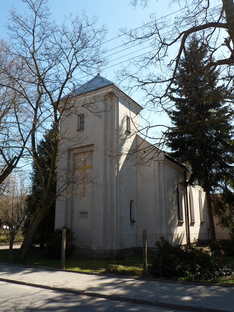 Początkowo stanął na nim dom parafialny z salką. Nabożeństwa w niej odprawiał ks. Mieczysław Rüger. Społeczny komitet budowy kościoła, do którego należeli najważniejsi przedstawiciele gminy, zlecił opracowanie jego projektu architektom braciom Goetzenom. Niewielką świątynię poświęcono w styczniu 1939 r., ale prace wykończeniowe trwały jeszcze jakiś czas.