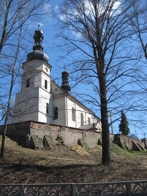 Świątynia jest pięknie położona na wzgórzu i dominuje nad okolicą. Znacznie przebudowano ten barokowy kościół w latach 1939-1945 i ma dość mocno zatarte cechy stylowe. Budowla jest orientowana, murowana z kamiennych ciosów i otynkowana. Składa się z trójprzęsłowej nawy i prezbiterium, od zachodu przylega czworoboczna wieża przechodząca na trzeciej kondygnacji w ośmiobok, od północy dobudowana jest kaplica, a od południa kruchta.