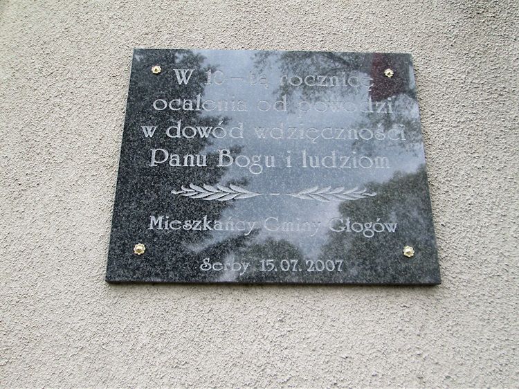 W 1997 roku południową i zachodnią Polskę nawiedziła ogromna powódź, nazwana później powodzią tysiąclecia. W miejscowości Serby, leżącej w bliskim sąsiedztwie Odry, w dziesiątą rocznicę tych wydarzeń mieszkańcy Gminy Głogów ufundowali tablicę pamiątkową nawiązującą do tych wydarzeń. Napis na tablicy brzmi: „W 10-tą rocznicę ocalenia od powodzi, w dowód wdzięczności Panu Bogu i ludziom”. Tablica znajduje się na murze kościoła pw. śś. Apostołów Piotra i Pawła.