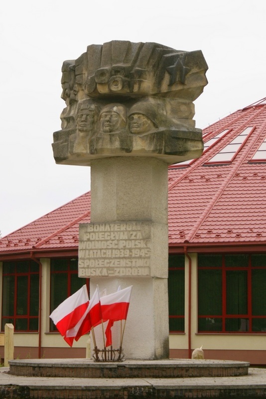 Pomiędzy Centrum Kultury a Parkiem Zdrojowym znajduje się kontrowersyjny pomnik poświęcony poległym bohaterom za wolność Polski w II wojnie światowej. Nawiązuje on do śmierci żołnierzy radzieckich walczących z okupantem hitlerowskim, o czym może świadczyć gwiazda umieszczona na pomniku. W bryle pomnika umieszczonej na wysokiej podstawie widnieją miedzy innymi twarze żołnierzy / radzieckich / lufy armatnie oraz gwiazda. Na podstawie pomnika umieszczony został napis „BOHATEROM POLEGŁYM ZA WOLNOŚĆ POLSKI W LATACH 1939-1945 SPOŁECZEŃSTWO BUSKA-ZDROJU”.