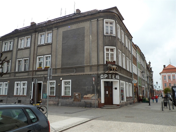 Jedną z kamienic, której część przeszłości możemy odtworzyć, jest budynek stojący w narożniku rynku i oznaczony numerem 16. Narożna kamienica z charakterystyczną rzeźbą lwa mieści dziś aptekę. Ta duża, dwupiętrowa kamienica o rysach klasycystycznych zbudowana została w XIX w. na zrębach wcześniejszego domu.