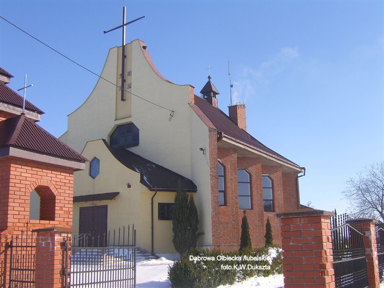 Dąbrowa Olbięcka to niewielka wioska licząca ok. 500 mieszkańców. Dojeżdża się do niej lokalną drogą od Olbięcina w kierunku Trzydnika Dużego. We wsi znajduje się kościół pod wezwaniem NMP Wspomożenia Wiernych. Teren pod budowę kościoła został podarowany przez rodziny Kilianków i Pyzików. Budowę kościoła rozpoczęto w roku 1983, poświęcenia dokonano w 1991. Kościół jest murowany z cegły, jego ściana frontowa jest otynkowana i pomalowana. Ściany boczne są parawanowe, zaś prezbiterium pięciokątne. W oknach umieszczono witraże.