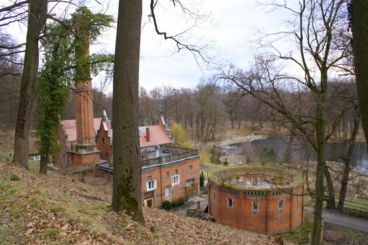 Obiekty te wzniesione z czerwonej cegły i kamiennymi zdobieniami nawiązywały stylem do architektury angielskiej, jedynie górujący nad tymi obiektami ośmioboczny wysoki komin wykonany został zgodnie ze wskazaniami projektanta pałacu, architekta Karola Schinkla.