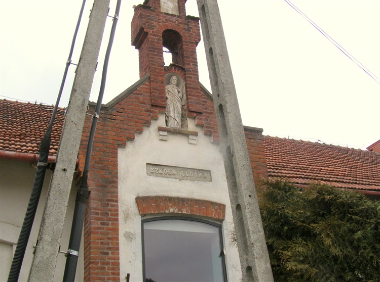 W ryzalicie znajduje się wejście do budynku szkoły, nad którym widnieje napis "Szkoła ludowa". To co najbardziej ciekawe przez "specjalistów" od energetyki zostało zasłonięte betonowymi słupami - jak by nie można było ustawić ich z pięć metrów dalej.