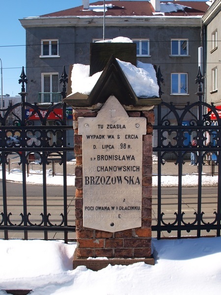Wiele razy mijałem tę tablicę i zawsze się zastanawiałem co wtedy w 1898 r. mogło się wydarzyć nieszczęsnej pani Brzozowskiej?. Po dość długich poszukiwaniach dotarłem do archiwalnej gazety "Rozwój" i w niej to znalazłem odpowiedź z dokładnym opisem tragicznego wypadku. Cyt: "... Doktorowa Bronisława Brzozowska powracała wraz ze swą 15 letnią córeczką Jadwigą ulicą Lutomierską do domu przy ul. Kościelnej. Na zbiegu ulic Lutomierskiej i Zgierskiej, gdy przechodziła na drugą stronę ulicy, zobaczyła pędzącego konia w uprzęży. Chcąc uniknąć niebezpieczeństwa poczęła uciekać ku latarni, za którą chciała się ukryć. Tymczasem rozbestwione zwierzę, widząc ją uciekającą popędziło za nią i przy samej latarni, stojącej przy parkanie kościelnym, uderzyło piersiami w plecy i w skroń, a następnie przygniotło do latarni tak silnie, że słup żelazny latarni został zgięty, nieszczęśliwa zaś uległa zgnieceniu klatki piersiowej..... Rozwścieczony koń został zatrzymany i znajduje się przy kancelaryi komisarza policyi I-go rewiru, jest on własnością Jana Szwarca, mieszkańca wsi Doły pod Łodzią". Źródło informacji - gazeta "Rozwój" 1898 r.