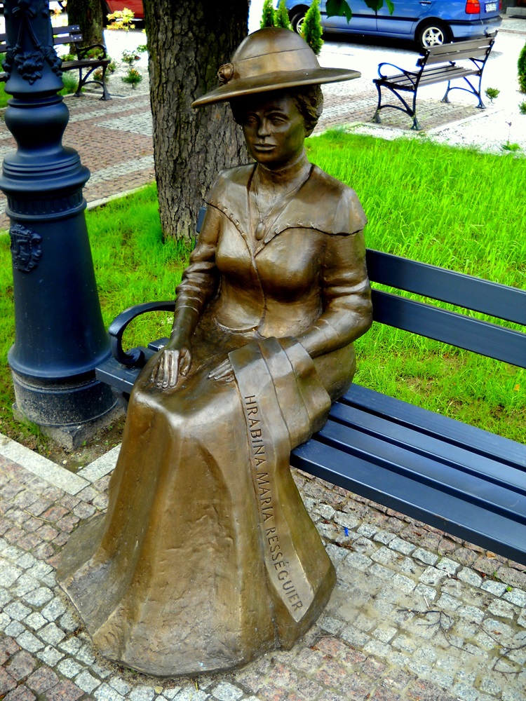 Hrabina Resseguier z rodu Kinskych wraz z małżonkiem Olivierem w latach 1868-1912 byli właścicielami Niska. Hrabina jest osobą wyjątkowo zasłużoną dla rozwoju miasta. W owym czasie Nisko przeżywało bujny rozkwit. Sama hrabina zainicjowała między innymi budowę kościoła, a także ufundowała szereg innych obiektów sakralnych. Dawna dobrodziejka Niska ma na plantach niżańskich swoją ławeczkę. Rzeźbę wykonał artysta Zbigniew Strzyżyński,autor ławeczki Bolesława Prusa w Nałęczowie.