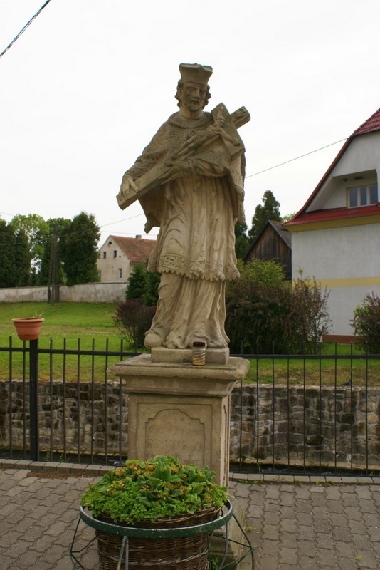 Pierwszą figurę spotkamy przy mostku nad Wilczką nieopodal kościoła św. Jerzego. Kamienna figura świętego stoi na kamiennym prostokątnym cokole z inskrypcją. Jan Nepomucen o sympatycznym wyrazie twarzy, ubrany w ślicznie prezentujące się szaty kapłańskie, trzyma w rękach kamienny krzyż z ukrzyżowanym Chrystusem. Opisana figura pochodzi z 1735 r.