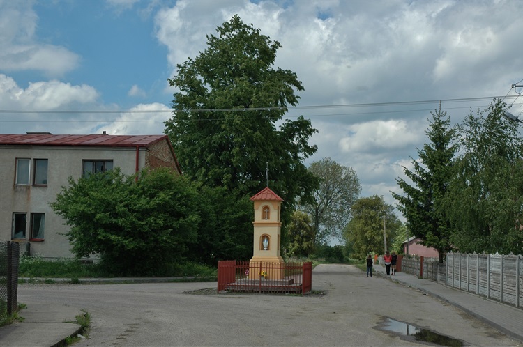 Podkrajewo jest to wioska leżąca między wioskami Wojnówką i Bogużynem jadąc od strony Mławy. W środkowej części tej wioski znajduje się skrzyżowanie i skręcamy w prawo. Po przejechaniu około czterystu metrów napotykamy ciekawą kapliczkę, stojącą na środku krzyżujących się dróg wewnątrz wioski. Można powiedzieć, że jest to jedno z pierwszych rond tak teraz modnych, bo wokół niej jest właśnie taki objazd utworzono już bardzo dawno, że nikt z mieszkańców już tego nie pamięta. Kapliczka jest świeżo pomalowana i zadbana,ogrodzona metalowym płotkiem (uprzednio był wykonany z elementów betonowych). Kształtem swym przypomina słup o wyglądzie Światowida gdyż posiada z czterech stron podwójne nisze w których znajdują się figury świętych oraz krzyże.