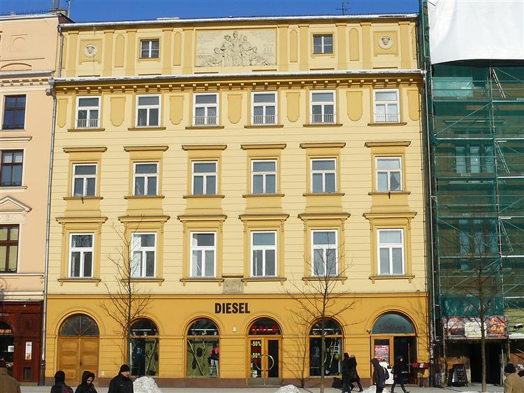 Duża kamienica powstała z połączenia dwóch mniejszych - Betmanowskiej i Bełzowskiej w 1834 roku. Na jej szczycie zwraca uwagę klasycystyczna attyka z płaskorzeźbą przedstawiającą m.in. Hermesa na tle żaglowca i pociągu (uważana za nowoczesną alegorię handlu). Kamienica, która znajdowała się po lewej stronie była własnością rodziny Bełzów. Z okien tej kamienicy królewska para Stefan Batory i Anna Jagiellonka oglądali występy artystów, popisy rycerstwa - jednym słowem festyn jaki zorganizował na rynku hetman Jan Zamoyski po zaślubinach z Gryzeldą Batorówną bratanicą króla.