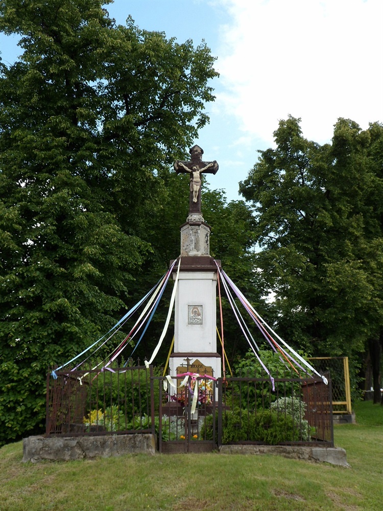 W miejscu, gdzie rozwidla się dawna droga prowadząca do tzw. białego pałacu i otaczającego go parku stoi jeden z wareckich obiektów małej architektury sakralnej. Jest nim murowana, pochodząca prawdopodobnie z XIX wieku, kapliczka z krzyżem i figurą ukrzyżowanego Chrystusa. Stojący na klinie obiekt zdobią dziś obraz z wizerunkiem Matki Boskiej oraz tablica z prośbą o pomyślność rolników. Kapliczkę otacza metalowy płotek, a jej tło stanowią pierwsze drzewa dawnego parku dworskiego.