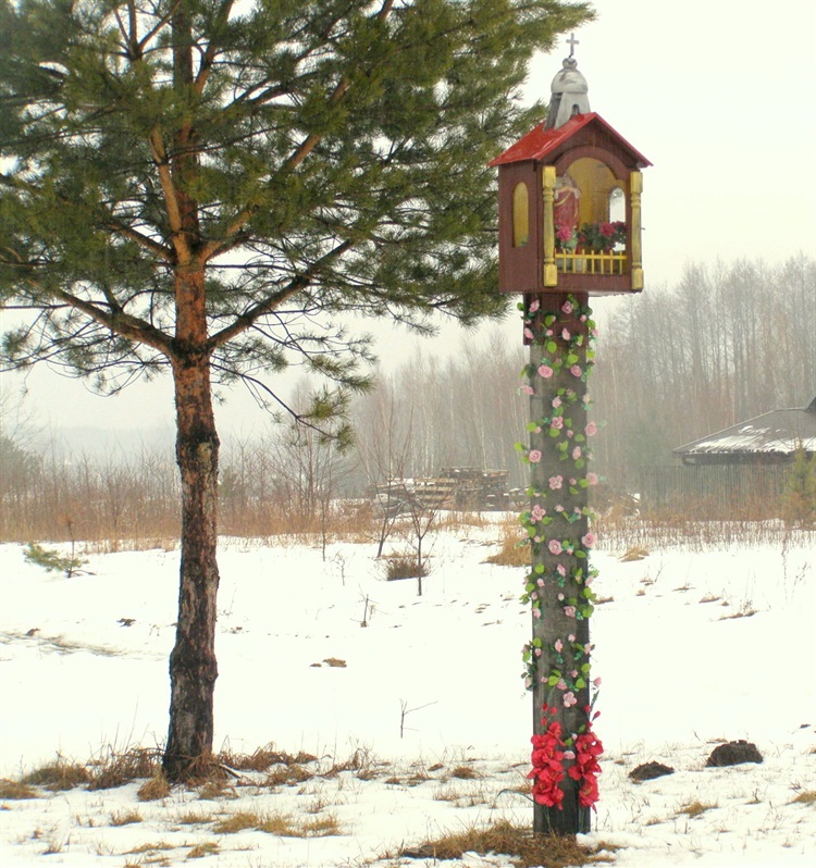 Z Huty Komorowskiej, jadąc drogą nr 872 w kierunku Woli Baranowskiej, dostrzegamy niewielką drewnianą kapliczkę na słupie. Kapliczka w kształcie domku od frontu ukazuje się jako łukowata arkada między dwiema kolumienkami, nakryta dwuspadowym daszkiem, zamyka ją niewielki płotek. W bocznych ściankach kapliczki są łukowato zamknięte od góry otwory okienne. W kapliczce umieszczono figurkę obrazującą serce Jezusa. Daszek kapliczki wieńczy wieżyczka ostrosłupowa z kopułą i krzyżykiem. Wydaje się, że ta ozdoba daszku pochodzi z wcześniejszej kapliczki, że jest znacznie starsza od obecnej kapliczki. Twórca obecnej kapliczki pozostawił ten element w pierwotnej barwie, przyglądając się z bliska, widać, że wieżyczka wykonana jest ze starego drewna.