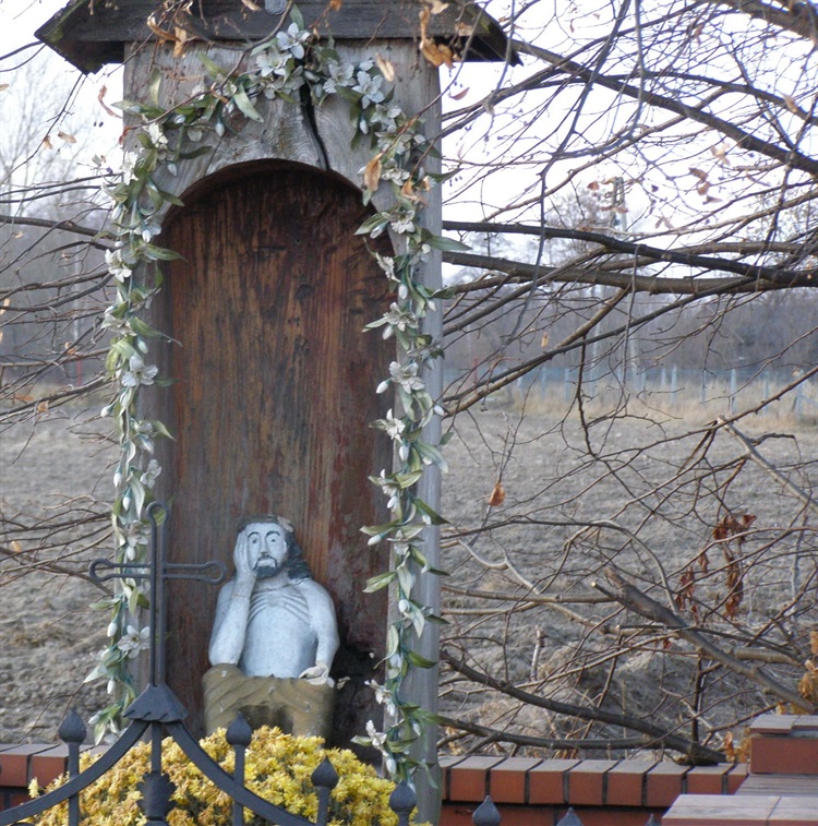 W Borowie, w wydrążonym pniu drzewa Chrystus Frasobliwy na drogę spogląda. Dawne kapliczki przydrożne zdobiły rzeźby i obrazy ludowe, teraz przychodzi moda na rzeźbione w drewnie. Szkoda, że Chrystus Frasobliwy jest głównym i przeważającym tematem - może by tak innych świętych też wyrzeźbić.