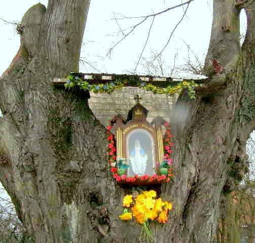 Kapliczka w ramionach starego drzewa w Potoku Wielkim urzeka swym pięknem. Mała, skrzynkowa, zawieszona na wysokości pomiędzy umiejętnie przyciętymi konarami starego drzewa. Za przeszklonym, od góry łukiem zamkniętym okienkiem widać figurkę Matki Boskiej. Powyżej napis : "Królowej Polski". Po bokach złoconymi listewkami zaznaczono jakby dwie kolumny zwieńczone sterczynami i małymi daszkami. Po środku kapliczki mała nadbudówka z koroną nakryta dwuspadowym daszkiem zwieńczona krzyżykiem. Całość to jakby miniatura fasady kościoła, bardzo ładnie i misternie wykonana. Kapliczka kwiatami przystrojona.