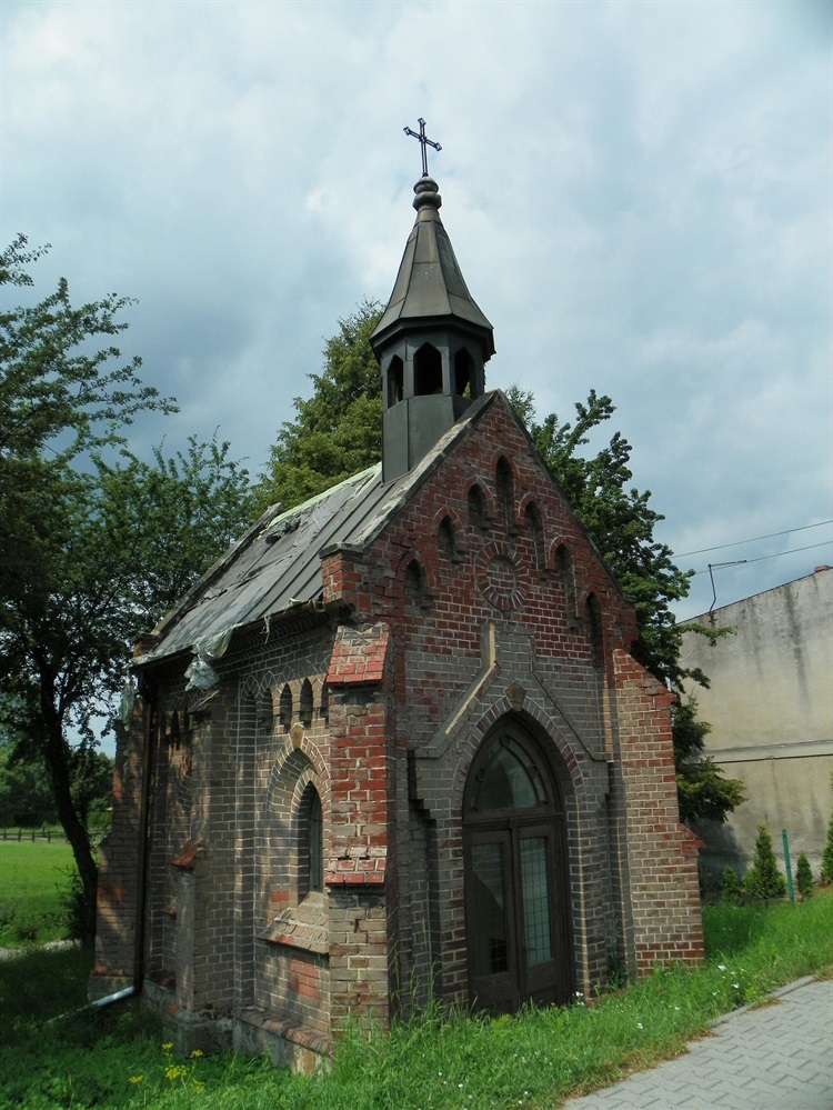 Sylwetą kapliczka przypomina neogotycki kościół, jakby wykonany był w pomniejszeniu. Cała kapliczka osadzona jest na kamiennych ławach fundamentowych, o ile nie na tzw. kamiennej podmurówce, spotykanej najczęściej przy kościołach drewnianych. Jest to budowla murowana z cegły pełnej, czerwonej, być może pierwotnie klinkierowej ( po ok. 126. latach nieco zatraciła swój oryginalny kolor czerwony ), w stylu neogotyckim, „oszkarpowana”, na rzucie prostokąta ( „nawa główna” może mieć wymiary: 4,2 mX2,6 m, a „absyda” może mieć powierzchnię 1,5 mX2 m2 ), z „absydą” na rzucie pięciokąta. Elewacje boczne charakteryzują się skromnymi zdobieniami w formie mniejszych ostrych łuków, nawiązujących do epoki gotyckiej. Łuki nad oknami w elewacjach bocznych są jakby „podwójne”, tj. tzw. główny i nieco cofnięty, coś w rodzaju dodatkowego obramowania otworu okiennego i wszystko wykonane w cegle. Ogólnie mała budowla nie jest jakąś „rewelacją architektoniczną”, lecz np. samo wykonanie ostrych łuków okiennych wymagało jednak podstawowych umiejętności od ówczesnego muratora. Elewacja frontowa należy do najbardziej zdobionych w porównaniu z bocznymi. Oprócz narożnych tzw. „oszkarpowań” ( przypory ), ściana szczytowa od strony frontowej, posiada skromne zdobienia w formie łuków podobnych do wspomnianych na elewacjach bocznych. Wokół otworu drzwiowego widoczne jest obramowanie nawiązujące jakby do wyżej położonej ściany szczytowej-coś w rodzaju symetrii.