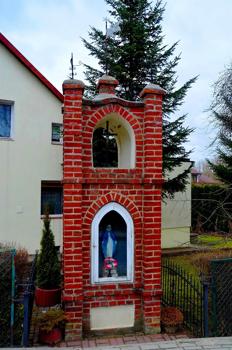 Prawie tuż za rogiem na wydzielonym terenie otoczonym metalowym płotem jest również neogotycka budowla, także murowana z czerwonej cegły, jednakże o znacznie innym kształcie niż poprzednia. Ta kapliczka ma korpus na węższym trzonie, górna część to ostrołukowa nisza z figurą a zwieńczenie to centralna sterczyna z krucyfiksem.