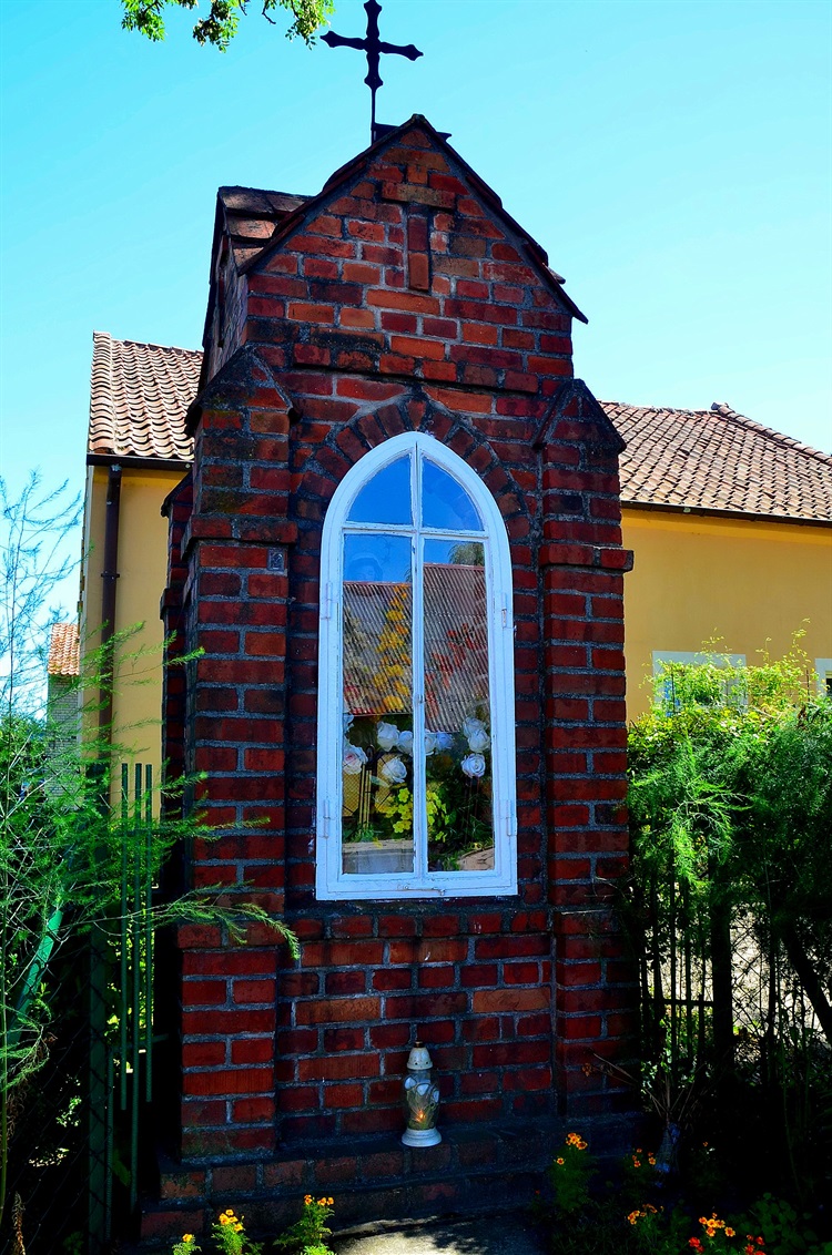 Pierwsza znajduje się na prywatnej posesji w ogródku wśród kwiatów. Wzniesiona została w 1862 r., jest murowana i nietynkowana, wielospadowy daszek przykryty jest dachówką, na daszku mieści się żelazny krzyż z chorągiewką. Od frontu jest duża i przeszklona ostrołukowa wnęka, wewnątrz której umieszczono figurę Matki Boskiej i kwiaty. Kiedyś kapliczka stała w innym miejscu, jednak dla jej bezpieczeństwa (duże natężenie ruchu) przeniesiono ją w 1978 r., dokonując zarazem renowacji.