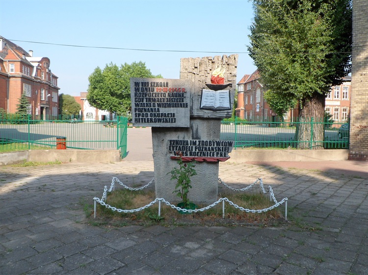 W 25. rocznicę powstania Polskiej Rzeczypospolitej Ludowej uczczono wznowienie polskiego szkolnictwa w Poznaniu pomnikiem przed wejściem na teren szkoły. Na obelisku poza okolicznościowym napisem widnieje książka i palący się znicz.