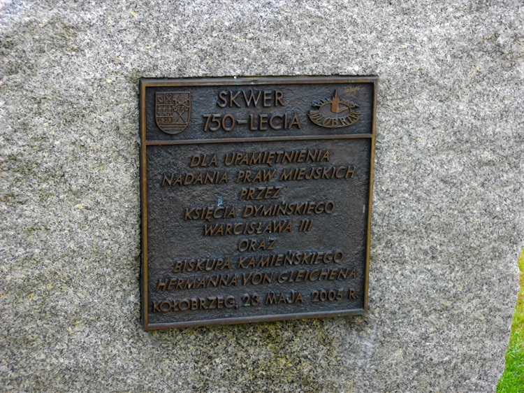 Jednym z wielu miejsc wypoczynku w Kołobrzegu jest Skwer 750-lecia. Jego nazwa upamiętnia rocznicę nadania praw miejskich. Prawa miejskie miasto otrzymało w 1255 roku. Nadał je Książę Dymiński - Warcisław III oraz Biskup Kamieński - Hermann von Gleichen. W rocznicę tego wydarzenia, dnia 23 maja 2005 roku odsłonięto obelisk z tablicą pamiątkową, nadając jednocześnie nazwę.