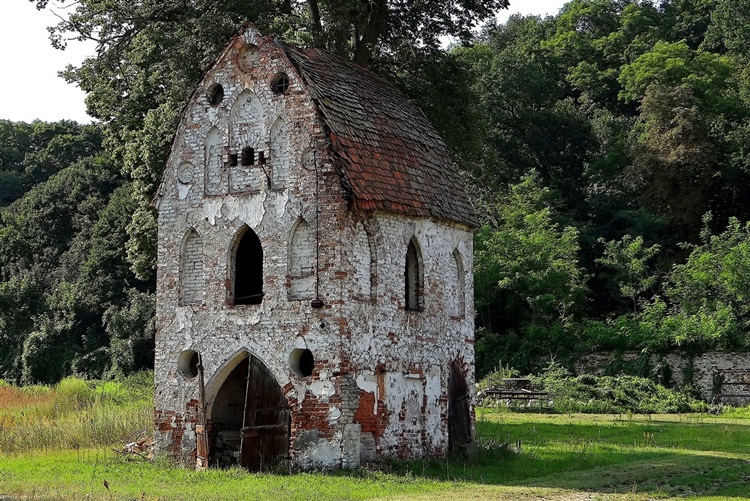 Pośrodku dziedzińca zwraca uwagę neogotycki, dwukondygnacyjny gołębnik. Niestety – lata świetności dawno ma już za sobą. Zachował się także, choć w bardzo kiepskim stanie budynek dawnych stajni i obór. Ozdobiono go terakotowymi medalionami. Umieszczone w nich wyobrażenia zwierzęcych głów mówią o przeznaczeniu poszczególnych części budowli.