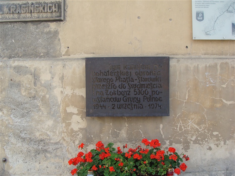 Przy placu Krasińskich,niedaleko pałacu znajduje się właz do kanału. W czasie powstania warszawskiego 1944 kanaly kanalizacyjne były głównym sposobem poruszania się po mieście.Tym włazem po bohaterskiej obronie Starego Miasta grupa 5300 powstańcow przedostala sie 2 września na Żoliborz i do Środmieścia. Wcześniej, bo 30 sierpnia stąd wyruszył desant powstańców,mających opanować Plac Bankowy. Na fasadzie pobliskiej kamienicy znajdują się dwie tablice upamiętniające ten fakt.