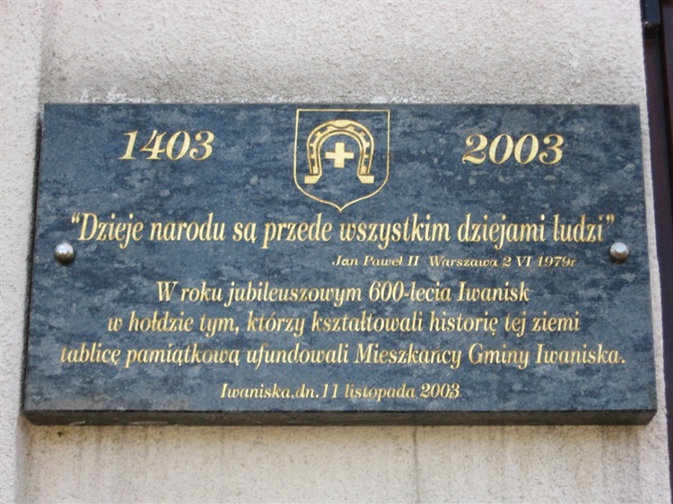 Na ścianie budynku Urzędu Gminy w Iwaniskach jest granitowa tablica ze stosowną treścią odsłonięta w hołdzie jej mieszkańcom, tym, którzy kształtowali przez setki lat historię tej ziemi. Została ufundowana w roku jubileuszowym 600-lecia Iwanisk przez mieszkańców gminy. Odsłonięto ją uroczyście 11 listopada 2003 roku. Znajdują się na niej słowa papieża Polaka z homilii wygłoszonej w czasie mszy św. odprawionej na warszawskim Placu Zwycięstwa 2 czerwca 1979 roku: "Dzieje narodu są przede wszystkim dziejami ludzi". U góry widnieją dwie daty 1403 - 2003, a pośrodku herb Iwanisk - niegdyś miasta.
