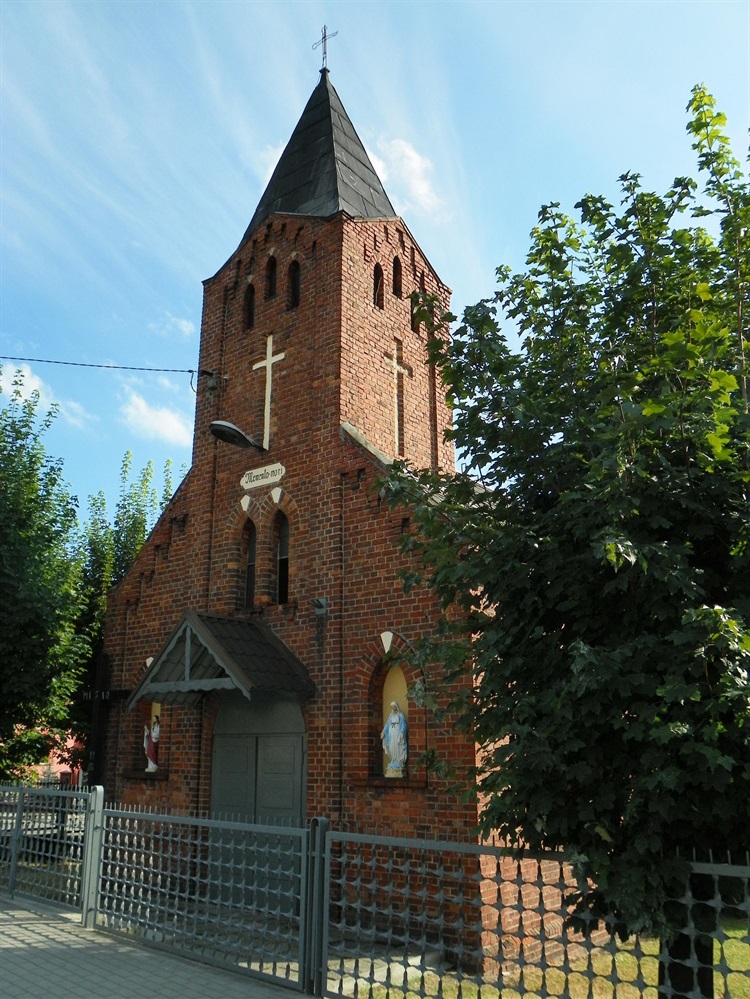 Od elewacji frontowej widoczna jest czworoboczna wieża zakończona piramidalnym hełmem. W jej ścianach szczytowych widoczne są zdobienia fryzem arkadowym. Podobne szczegóły architektoniczne można zauważyć na ścianach szczytowych tzw. ramion, które tworzą po bokach korpusu świątyni, transept. Otwory okienne i drzwiowe zamknięte są ostrymi łukami , nawiązującymi do epoki gotyku. W oknach prezbiterium widoczne są witraże z postaciami czterech Ewangelistów.