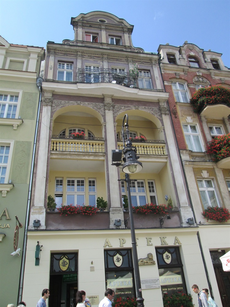 Apteka „Pod Złotym Lwem” znajduje się przy Starym Rynku pod numerem 75. W 1793 roku kamienicę kupił i przebudował architekt Antoni Hoene. W kamienicy tej mieszkało wiele znanych osobistości, m.in. Karol Marcinkowski. Obecna, eklektyczna fasada została zaprojektowana na początku XX wieku przez Teubnera. Jako jedna z nielicznych została nieuszkodzona w okresie II wojny światowej. Na budynku znajduje się tablica pamiątkowa upamiętniająca zawieszenie polskiego sztandaru dnia 28 grudnia 1918 roku przez powstańca wielkopolskiego por. Janusza Leszczyńskiego. Sztandar przekazali mu ówcześni właściciele apteki – Klara i Marian Dalscy.