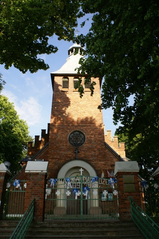 Pierwotnie w miejscu tym na niewielkim wzniesieniu stał kościół drewniany. Obecny kościół murowany z czerwonej cegły i przykryty dwuspadowym dachem powstał w latach 1917–1927. Nad świątynią góruje czworoboczna wieża - dzwonnica. W wyposażeniu świątyni na uwagę zasługuje osiemnastowieczny krucyfiks umieszczony na belce tęczowej oraz chrzcielnica również z XVIII wieku. Teren kościoła otoczony jest metalowym, ozdobnym ogrodzeniem.