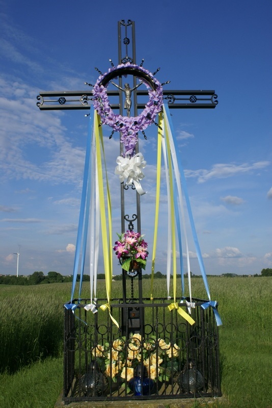 Wyjeżdżając z Łaszewa w kierunku wsi Strugi po prawej stronie lokalnej drogi ustawiony jest metalowy krzyż ozdobny. W centralnej części krzyża pod ozdobnym wygiętym daszkiem umieszczona została ukrzyżowana figurka Chrystusa. Wokół figury promieniście rozmieszczone zostały metalowe pręciki emitujące promienie słoneczne. Krzyż ozdobiony jest sztucznymi kwiatami oraz różnokolorowymi wstęgami. Wokół krzyża ustawione jest niskie metalowe ogrodzenie.