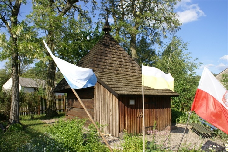 Drewniana zrębowa kapliczka wzniesiona została w drugiej połowie XVIII w. Wykonana została na rzucie kwadratu, przykryta jest czterospadowym gontowym dachem zwieńczonym drewnianym krzyżem. Do kapliczki od frontu dobudowana została prostokątna przybudówka (kruchta) prowadząca do środka kapliczki. Wewnątrz jest ołtarzyk, na którym stoi figurka Matki Boskiej. Nad ołtarzem znajduje się płaskorzeźba przedstawiająca Chrystusa Króla oraz śś. Stanisława Kostkę i Wojciecha po bokach.