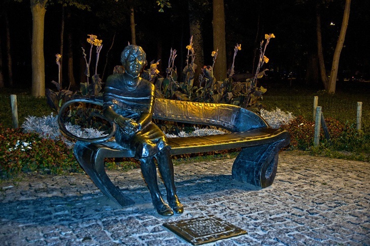 Ławeczka została zaprojektowana i wykonana przez poznańskiego rzeźbiarza i odlewnika Piotra Garstka. Początkowo ławeczkę wystawiono w jednej z sal Urzędu Miasta w Ustce. Obecnie ławeczka stoi w Parku Zdrojowym przy promenadzie. Ławeczka przypomina zwój taśmy filmowej. Powstała z inicjatywy Urzędu Miasta z wykorzystaniem nadwyżki opłaty uzdrowiskowej i modernizacji Parku Zdrojowego.