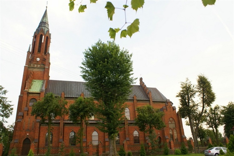 Kościół murowany z czerwonej cegły, trójnawowy w stylu neogotyckim został wzniesiony w latach 1909-14. Nad świątynią wznosi się wysoka kwadratowa wieża z rozetą nad wejściem. Na ostatniej kondygnacji wieży zainstalowany został zegar z 1938 r., którego tarcze widnieją na każdej ścianie, a za żaluzjami zawieszono dzwony. Wewnątrz świątyni warto zwrócić uwagę na chrzcielnicę z XVI w. oraz barokowy ołtarz boczny z obrazem Matki Boskiej Częstochowskiej pochodzący prawdopodobnie z XVIII. Kościół konsekrowany został w 1919 r.
