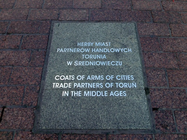 Na prostokątnych płytach, wtopionych w deptak Starówki widnieją stylizowane herby i nazwy miast partnerskich Torunia. Płyty takie znajdują się również na ul. Królowej Jadwigi. Prawdziwa spacerowa lekcja historii - polecam.