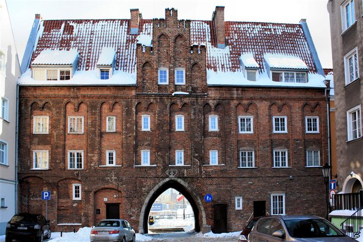 Jest to jedna z gdańskich bram wodnych. Wzniesiona została w stylu gotyckim w XIV wieku. Przejazd obramowany jest ostrołukowymi portalami. Od strony Motławy umieszczono herb Gdańska jeszcze bez korony, a od strony ul. Chlebnickiej widnieje znak lilii - dawny herb książąt Pomorza Gdańskiego. Ściany zabytku zwieńczone są gzymsami, ponad którymi wybudowano ozdobne schodkowe szczyty. Całość pokrywa dwuspadowy dach.