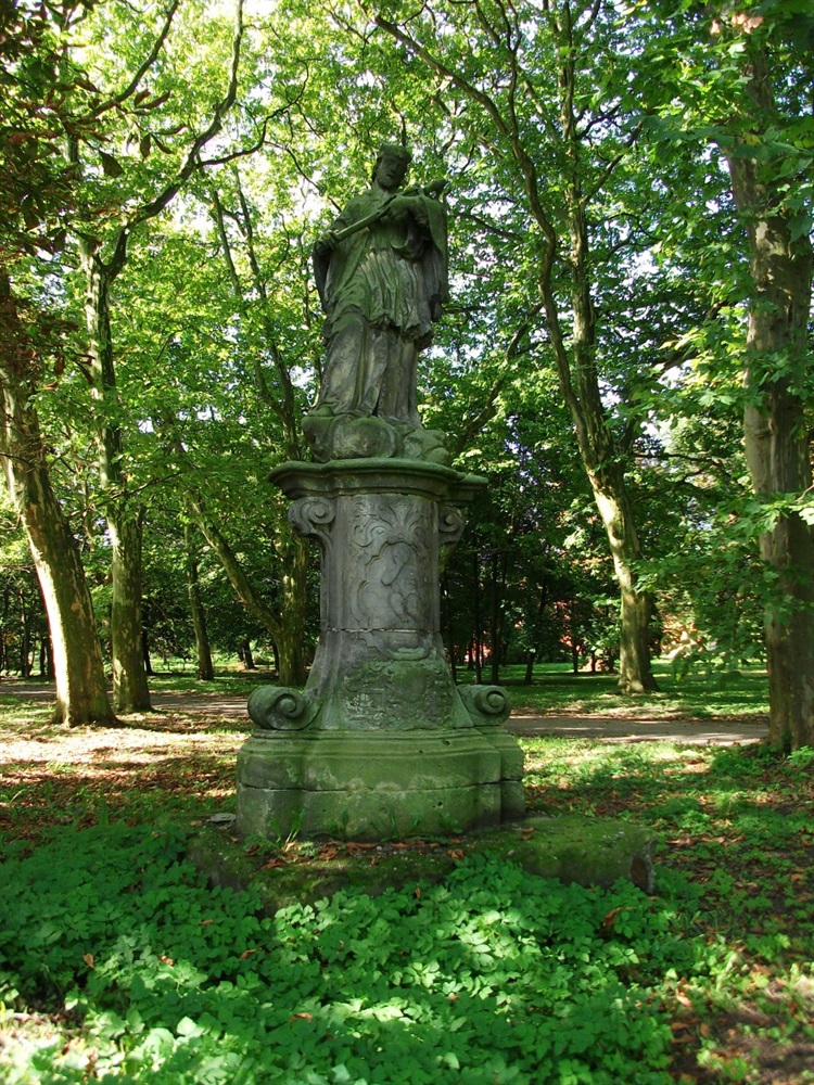 Gołębiński św. Jan Nepomucen znajduje się na terenie parku pałacowego, w miejscu, w którym prawdopodobnie znajdował się w początkach XVIII w. cmentarz choleryczny. Barokowa, wykonana z piaskowca rzeźba pochodzi z około 1730 r. Postać czeskiego kanonika przedstawiona jest w typowej dla barokowego okresu formie. Na uwagę zasługuje także bogato zdobiony wolutowy cokół. Figura św. Jana Nepomucena jest drugim, po kościele parafialnym, najstarszym obiektem wsi.
