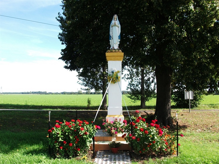 Wspomniana kapliczka na rozstaju dróg poświęcona jest Matce Boskiej. Ufundowana została na przełomie XIX i XX w. Zdobiła to miejsce do 1940 r., kiedy to Niemcy zniszczyli figurę. Jej części przez okres okupacji przechowali mieszkańcy Starego Gołębina. Kapliczka doczekała się odbudowy w 1959 r., o czym informuje okolicznościowa tablica wmurowana w podstawę kolumny. Figurę w ostatnim okresie odrestaurowano.