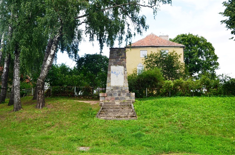 Pomnik usytuowany jest na wysokiej skarpie górującej nad placem gminnym w pobliżu ulicy Węgorzewskiej, oraz tuż przy budynku szkolnym. Intencją wystawienia było upamiętnienie 60 mieszkańców tej miejscowości którzy zginęli w bitwie nieopodal Pozezdrza i do której doszło w 1914 r. Do 1945 r. szczyt tego obelisku wieńczył krzyż teutoński przeniesiony z uszkodzonego podczas działań wojennych miejscowego kościoła, po wojnie krzyż został usunięty z pomnika.