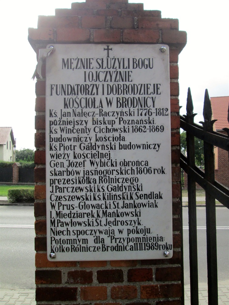 W Brodnicy przy głównej bramie prowadzącej na dziedziniec kościoła św. Katarzyny Aleksandryjskiej znajduje się tablica z nazwiskami osób zasłużonych zarówno dla kościoła, jak i dla tej pięknej miejscowości. Ufundowana została przez Kółko Rolnicze dnia 11 listopada 1989 roku. Główny napis na tablicy brzmi: „Mężnie służyli Bogu i Ojczyźnie, fundatorzy i dobrodzieje kościoła w Brodnicy”. Umieszczono na niej 15 nazwisk. Wymieniony jest tam m.in. ks. Jan Nałęcz Raczyński – biskup poznański oraz gen. Józef Wybicki.