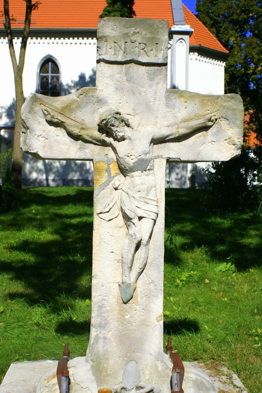 Przed kościołem p.w. Najświętszego Serca Pana Jezusa stoi kamienny krzyż wysokości około 186 cm, długości ramion 105 cm oraz grubości 27 cm. Na krzyżu widnieje postać ukrzyżowanego Jezusa Chrystusa z napisem nad głową INRI - Jezus Nazarejczyk Król Żydowski (tekst ten umieszczany nad głową ukrzyżowanego Chrystusa wyjaśnia, dlaczego Piłat skazał go wg prawa rzymskiego na śmierć). Krzyż ten znaleziony został na miejscu pochowania kilkuset mieszkańców pobliskich Mikowic zmarłych w wyniku epidemii zarazy w 1696 r.