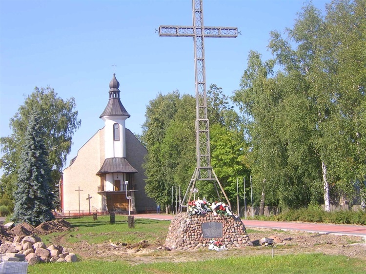 Krzyż przed kościołem z metalowej kratownicy ustawiony jest na murowanym stosie kamieni. Tablica pamiątkowa informuje nas, że krzyż postawiono na pamiątkę ks. Błażeja Nowosada oraz parafian poległych w czasie II wojny światowej. Świątynię w roku 2006 poświęcił bp Jan Śrutwa.