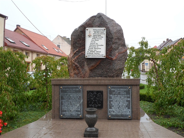 Pomnik ofiar II wojny światowej stanowi duży głaz narzutowy posadowiony na murowanym postumencie. W jego górnej części znajduje się tablica z 1966 r. z nazwiskami zamordowanych przez hitlerowców 12 mieszkańców Ziemi Wieleńskiej. Natomiast na marmurowym cokole widnieją tablice z nazwiskami poległych żołnierzy w wojnie obronnej 1939 r. oraz osób zamordowanych w obozach koncentracyjnych.