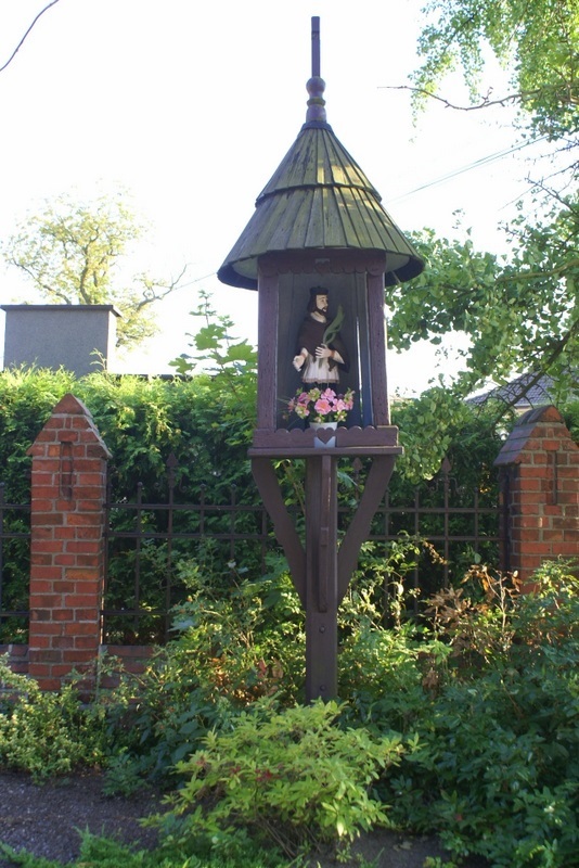 Pierwsza figura umieszczona jest wewnątrz niewielkiej drewnianej kapliczki przykrytej namiotowym daszkiem. Jest to ludowa figura wykonana z drewna i przedstawia świętego w stroju kapłańskim i gałązką palmy w ręce. Kapliczka usytuowana jest na placu przy kościele NMP Anielskiej. Rekonstrukcja tej kapliczki znajduje się w skansenie Wsi Opolskiej w Opolu.