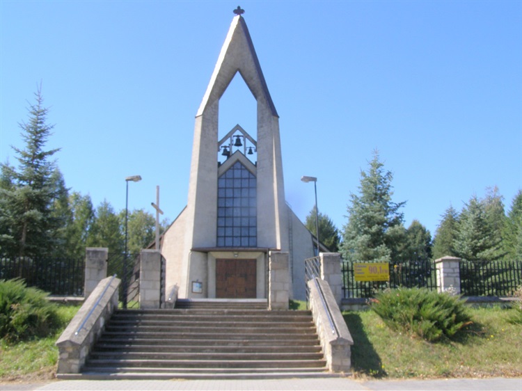 Kościół murowany z betonu i cegły. Ścianę frontową uwydatnia trójkątnie zamknięta, murowana, konstrukcja otwartej wieży - dzwonnicy. Kościół pod wezwaniem Wniebowzięcia N M P.
