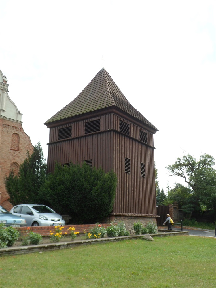 Przed kościołem św. Wojciecha, od strony zachodniej jego fasady stoi nie mniej interesujący zabytek. Jest nim drewniana dzwonnica pochodząca z przełomu XVI i XVII wieku. Obiekt ten wzniesiono na kamiennym fundamencie i ceglanej podmurówce. Dzwonnica zbudowana została na rzucie kwadratu i nakryta czterospadowym dachem krytym gontem. W XVIII wieku rozebrano wieżę kościoła, wtapiając jej elementy w konstrukcję świątyni. Wówczas przeniesiono z niej dzwony do drewnianej dzwonnicy.