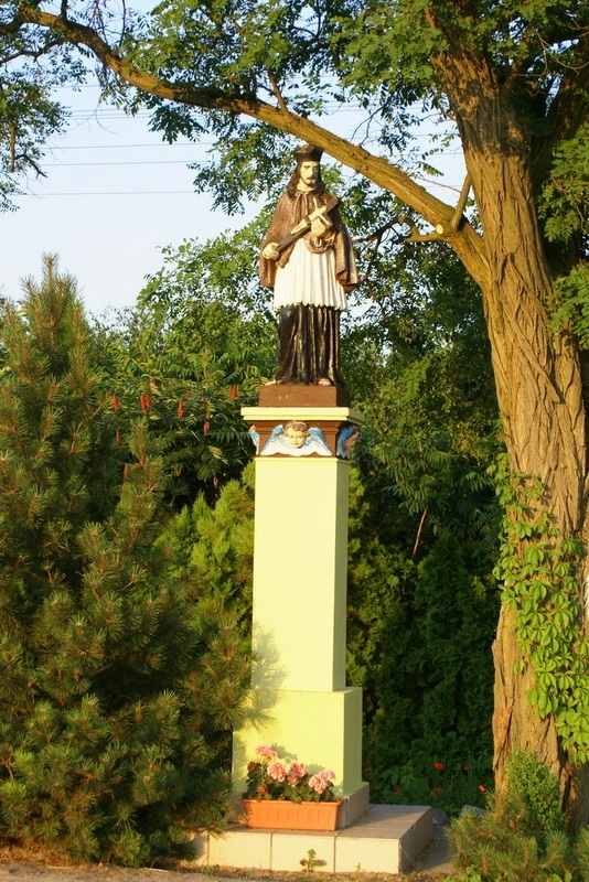 Wysoki prosty postument zwieńczony jest główkami aniołków, a na nim stoi kamienna figura przedstawiająca św. Jana Nepomucena. Ubrany jest w czarną sutannę, białą komżę oraz brązową pelerynę. Spod biretu na kark opadają długie włosy. Do piersi przyciska krzyż trzymany w obu rękach.