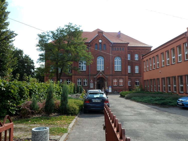 Na miejsce inwestycji wybrano teren pomiędzy kościołem parafialnym i dawnym klasztorem. Nową szkołę wzniesiono w latach 1875-1877. Budowla powstała z nietynkowanej, ceramicznej cegły w stylu nawołującym detalami do architektury romańskiej. Obok szkoły zbudowano połączoną z nią krużgankami salę gimnastyczną.