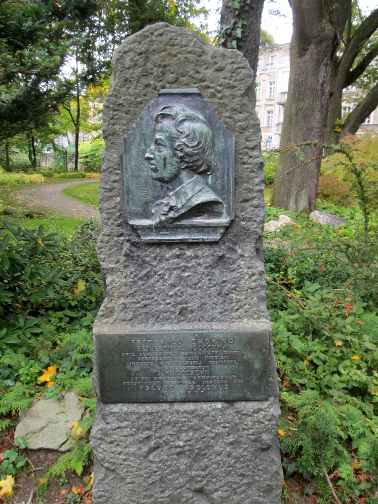 Jest to dwumetrowy głaz diorytowy z brązowym medalionem przedstawiającym popiersie Fryderyka Chopina. Pod medalionem umieszczona jest tabliczka, na której umieszczono napis w języku łacińskim. Jego tłumaczenie brzmi: „Fryderykowi Chopinowi, który w Dusznikach w roku 1826 swą sztuką prawdziwą i wysoką kulturą szlachetny duszy charakter w zaraniu młodości okazał, pomnik ten ku wiecznej rzeczy pamięci za pozwoleniem władz miejskich Polak Polakowi wystawił”.