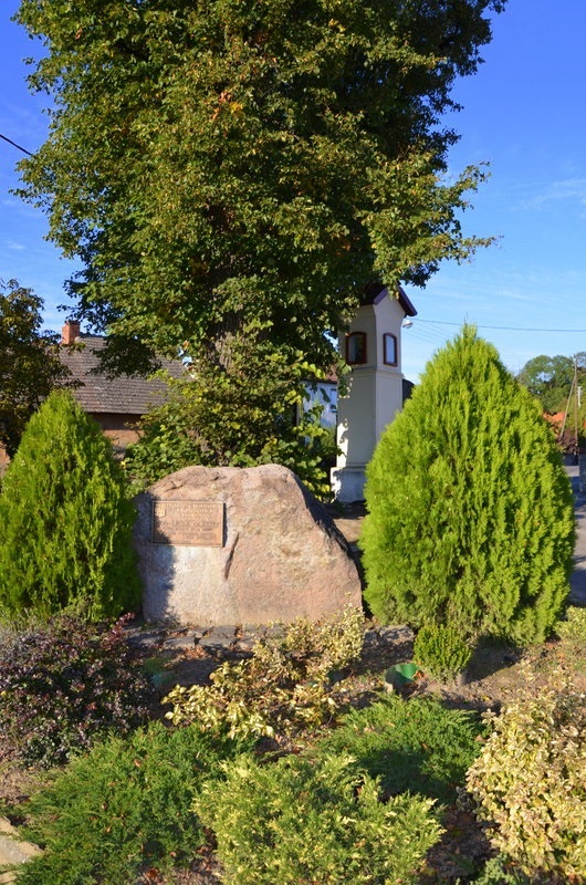 Pamiątkowy kamień położony jest nieopodal prostej słupowej kapliczki pamietającej wojnę trzydziestoletnią (1618 - 48) oraz drewnianego krzyża z 1989 r. z ukrzyżowanym Chrystusem i figurką Matki Boskiej umieszczonej na jego trzonie.